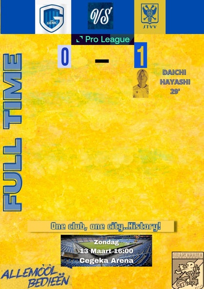 Een doelpunt van Hayashi in de eerste helft was voldoende voor de derbywinst. STVV komt tot 3 puntjes van G*NK, het heeft nu 42 punten in het klassement. Limburg kleurt geel en blauw!