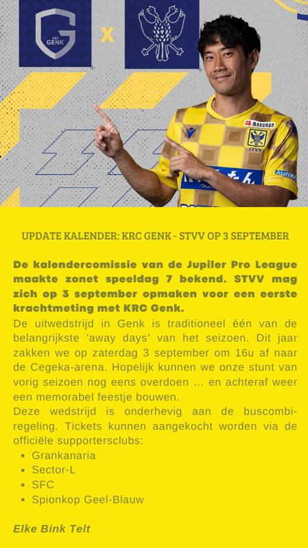 Met nog 3 wedstrijden te spelen loopt de reguliere competitie bijna ten einde. STVV beleefde een stabieler seizoen dan het vorige en staat momenteel na de knappe derbyzege op een mooie 10de plaats, waarbij Play-Off 2 nog steeds mogelijk is. Laten we dit seizoen eindigen op een positieve noot door minstens 8.000 supporters op Stayen te krijgen voor de laatste wedstrijd van het seizoen. STVV rekent nu, meer dan ooit op zijn vurige 12de man! Komende zondag houden we alvast een generale repetitie tegen de rode lantaarn K. Beerschot VA. Tickets beschikbaar via deze link.